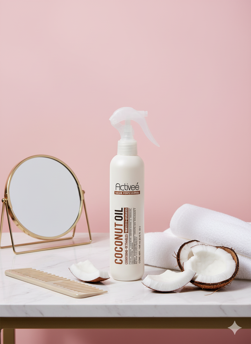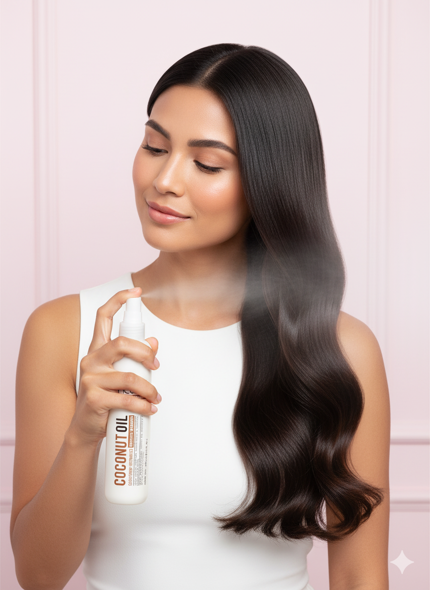 Spray protector con aceite de coco que hidrata profundamente, facilita el desenredado y controla el frizz. Protege el cabello del calor de planchas y secadores, dejando una textura suave, sedosa y con brillo natural. Ideal para cabellos resecos o dañados.