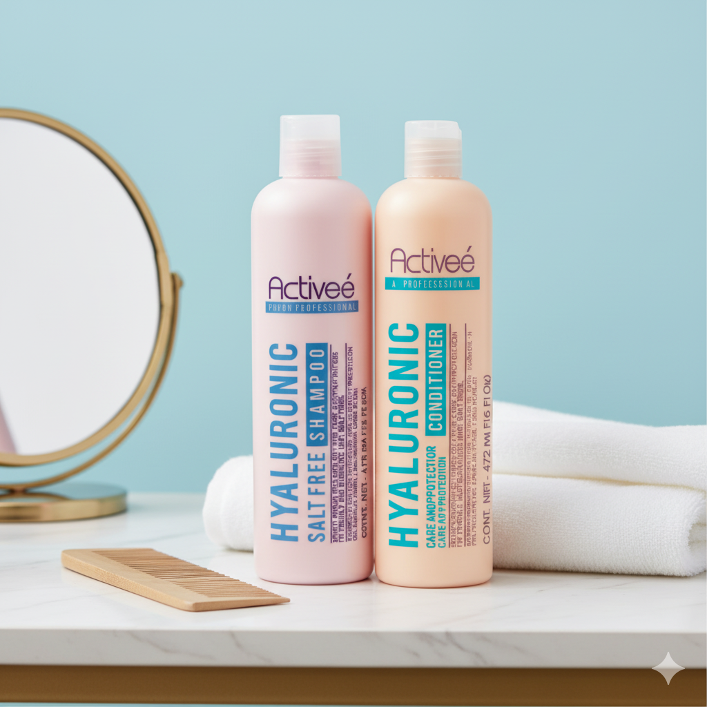 Hidratación intensa y rejuvenecimiento capilar. Shampoo sin sal y acondicionador con ácido hialurónico que restauran la suavidad, elasticidad y brillo del cabello. Ideal para cabello reseco o con daño químico.